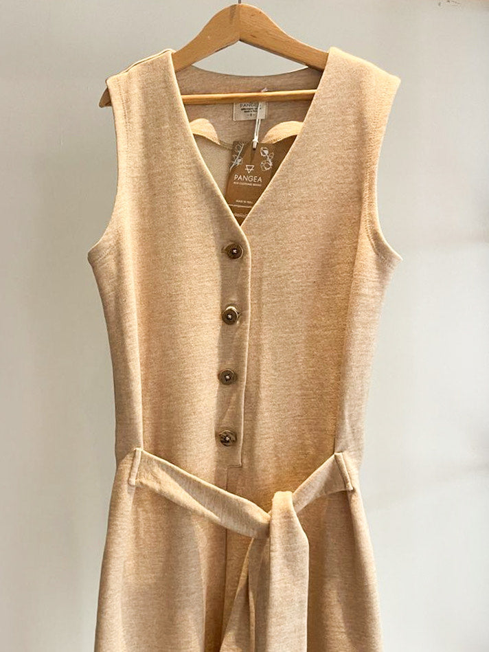 Confeccionado en french terry de algodón orgánico certificado, ofrece una caída suave y cómoda. Presenta botones en el pecho, correa a la cintura y pantalón tipo palazzo.