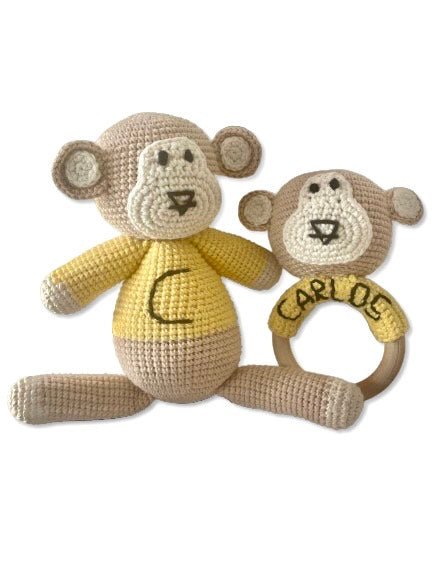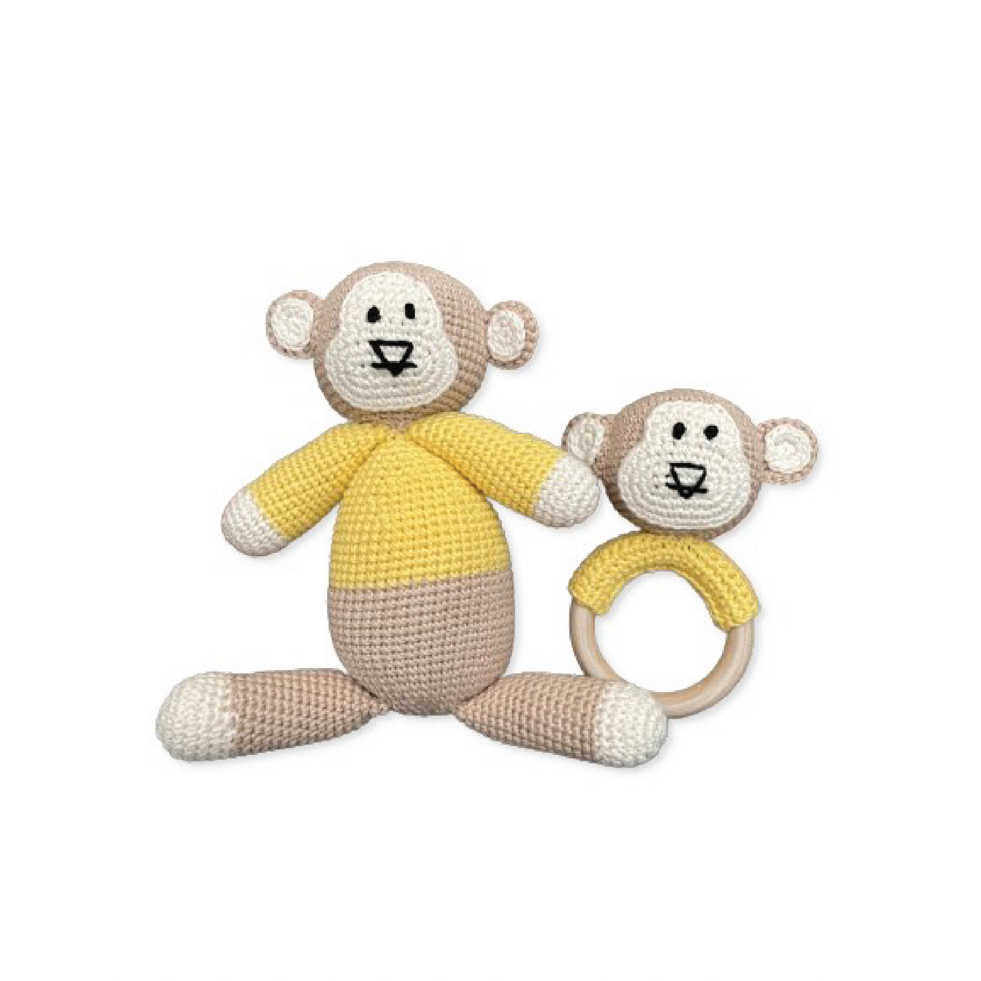Este pack incluye un amigurumi de monito y sonaja a juego, tejidos con hilos de algodón orgánico y una sonaja de bambú. Para los detalles del rostro, hemos utilizado hilo de 100% algodón deadstock en color negro. Todos los materiales son ecológicos y naturales asegurando que tu bebé pueda jugar de manera segura y sin preocupaciones.