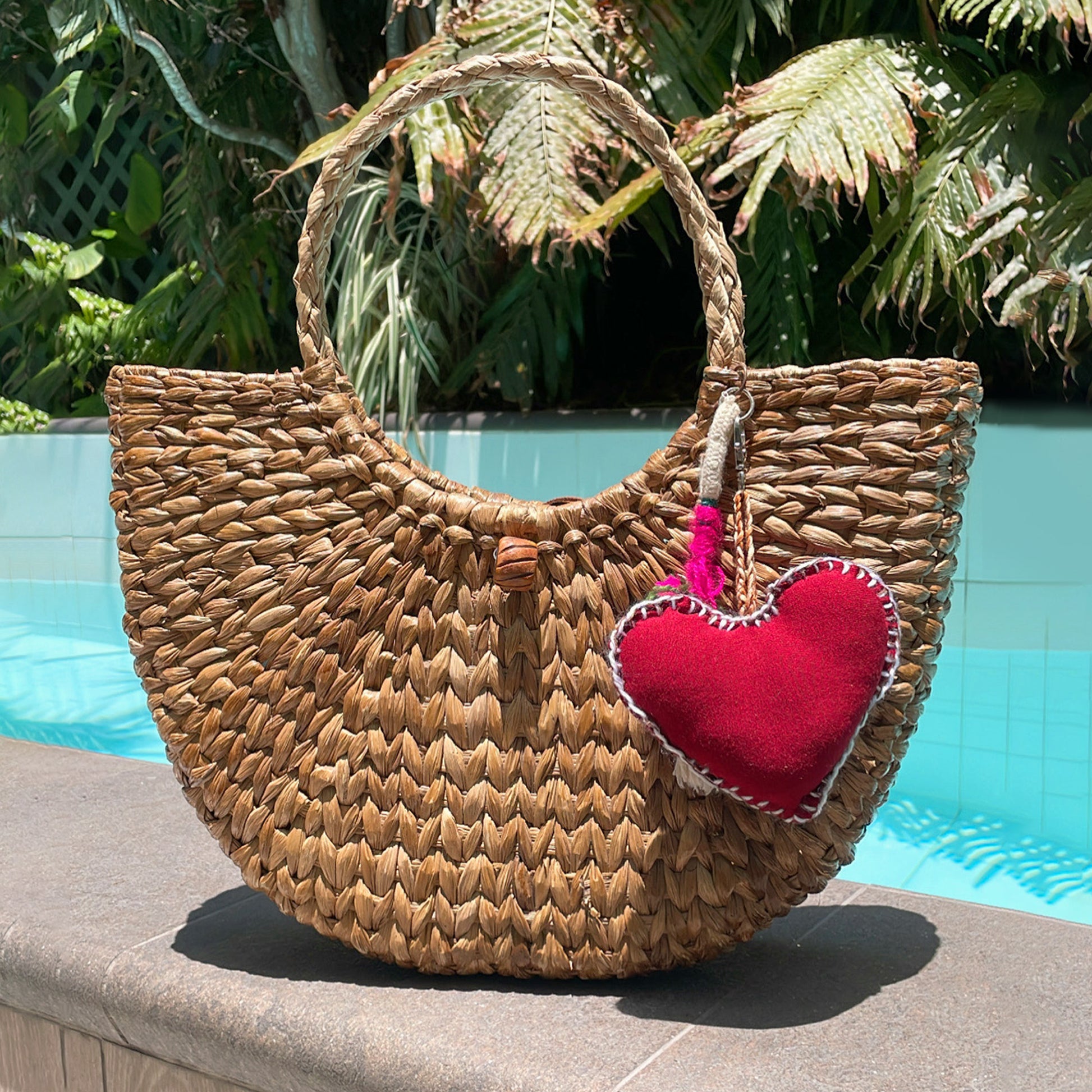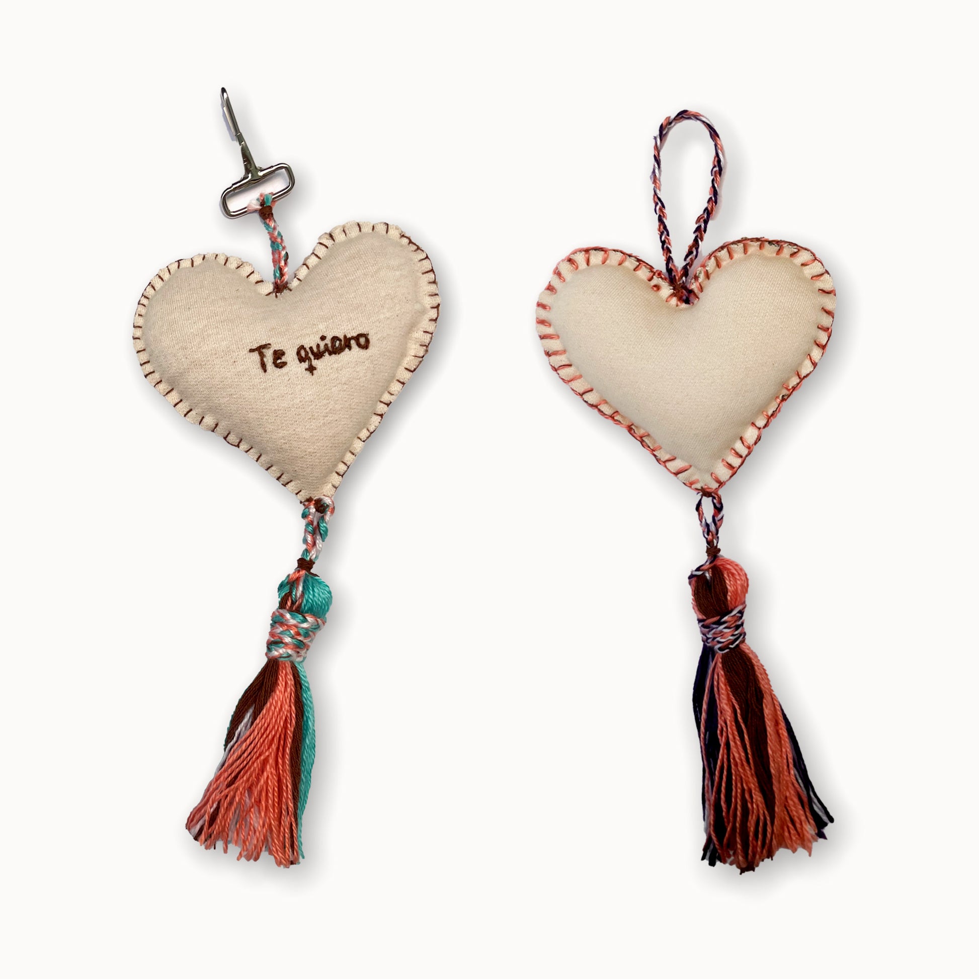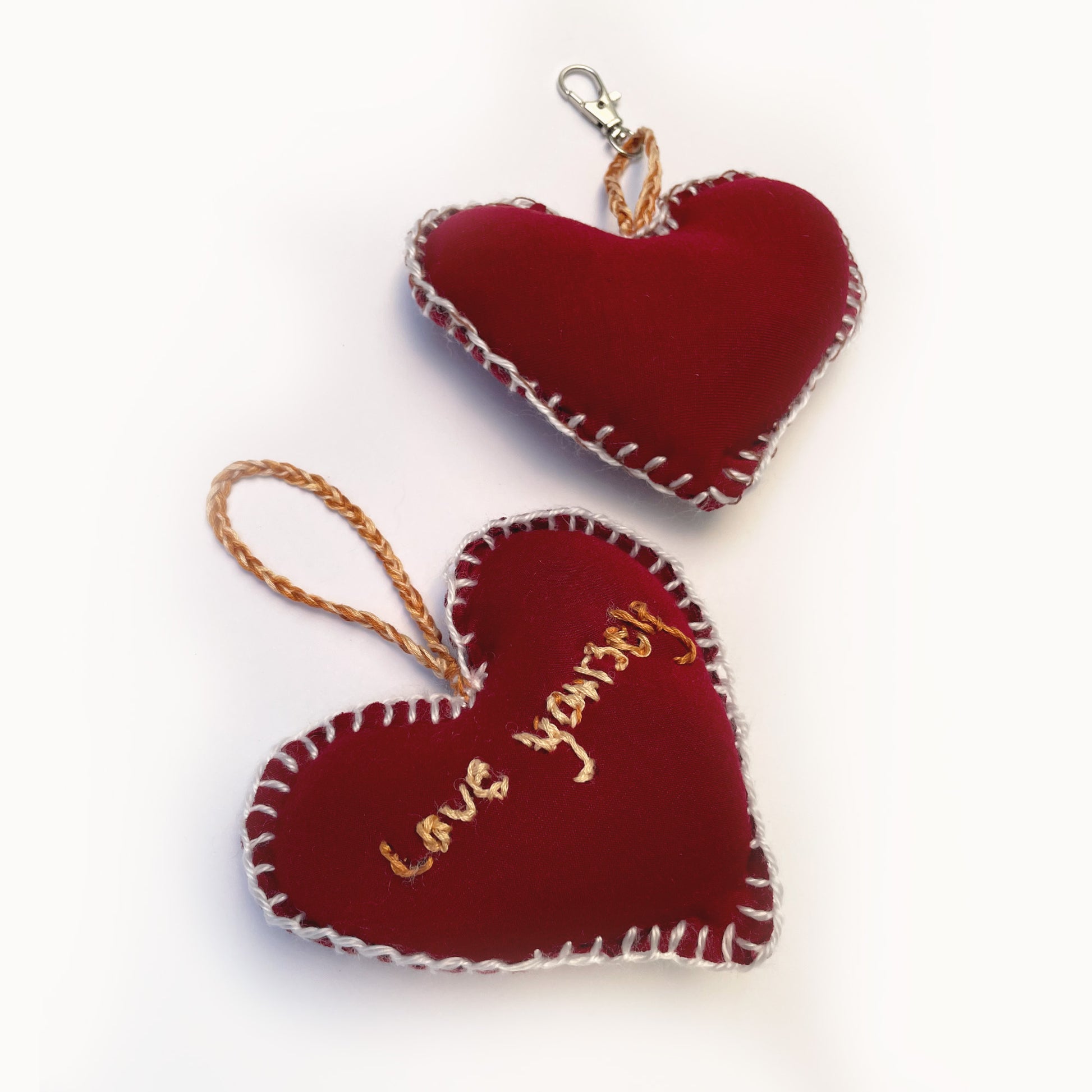 Colgantes bordados hechos con retazos de telas. Se pueden utilizar como llaveros para las carteras y también para colgar en las puertas.