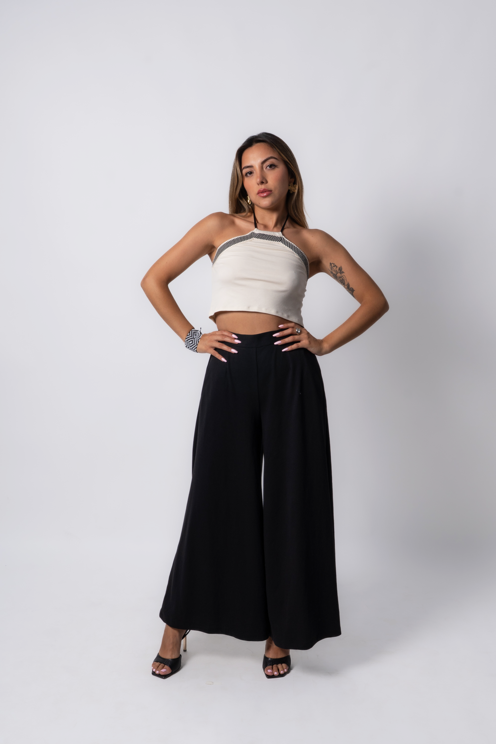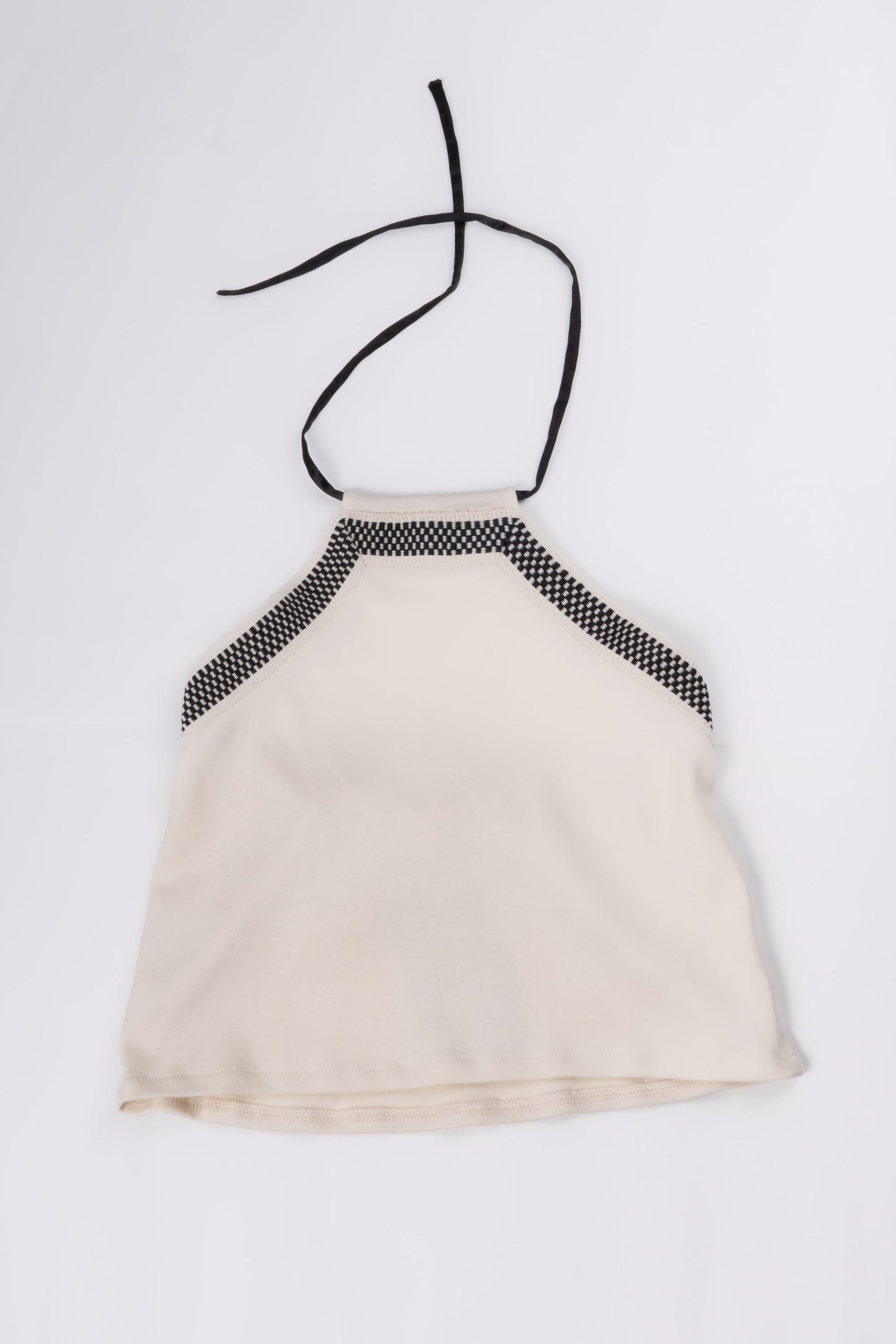 Un top versátil y atemporal, confeccionado en rib de algodón deadstock con certificación OEKO-TEX, que garantiza sostenibilidad y comodidad. Su diseño con cuello halter estiliza la silueta, haciéndolo ideal tanto para looks casuales como para ocasiones más elegantes.