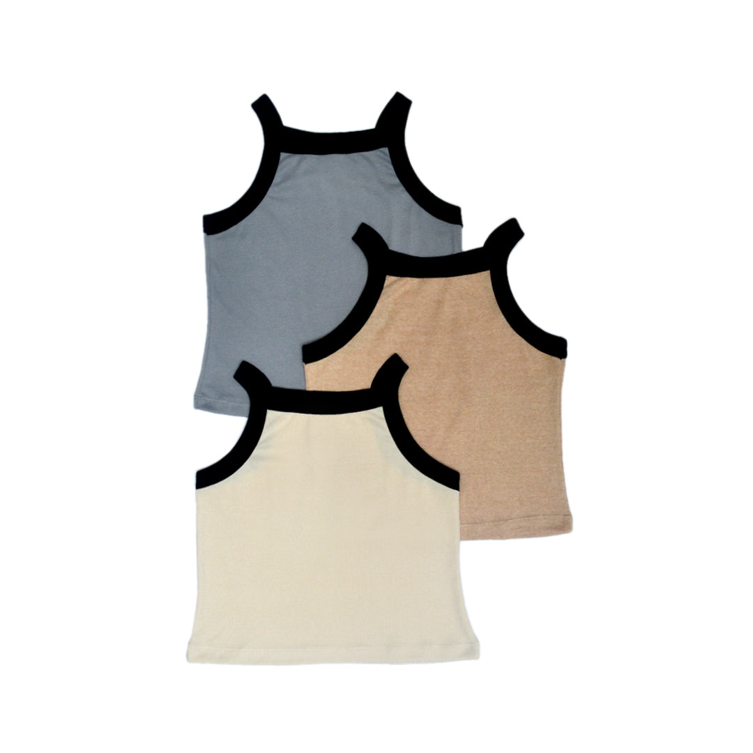 Top de algodón 100% orgánico. Disponible en 3 colores: gris, beige y blanco con detalles en color negro.