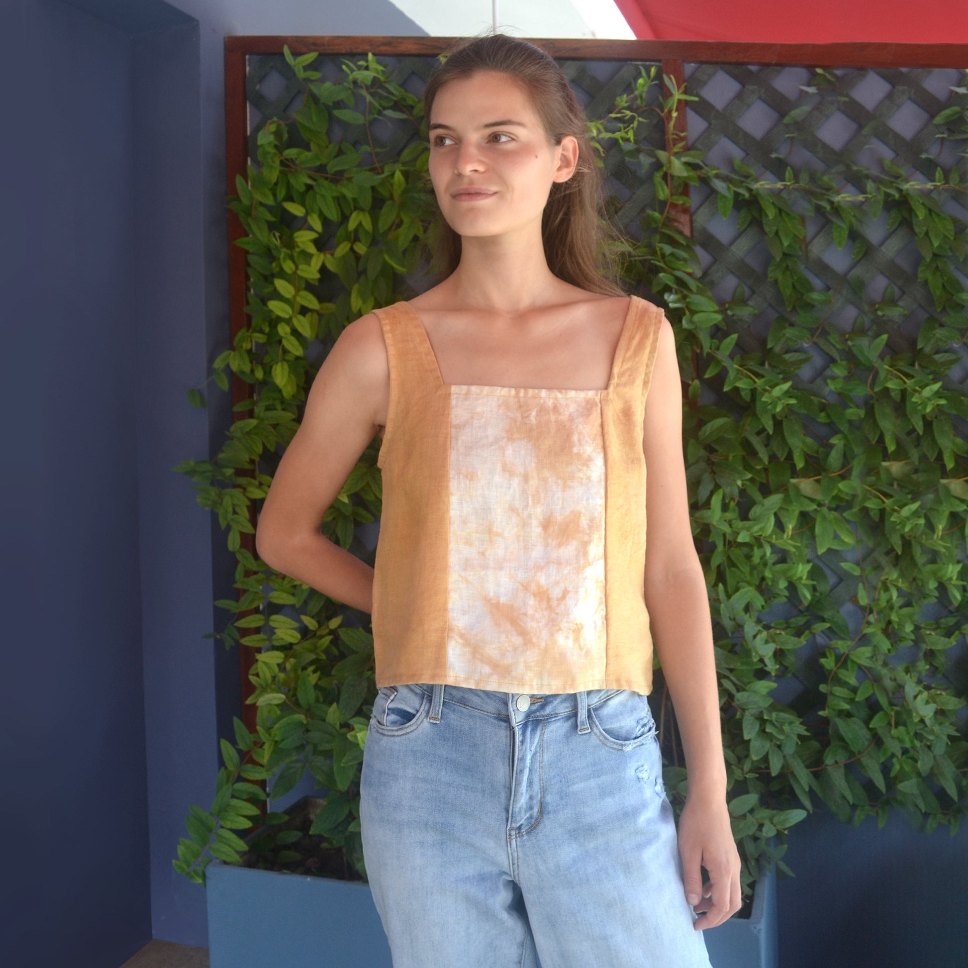 Top de lino teñido con tinte natural y diseño en el centro