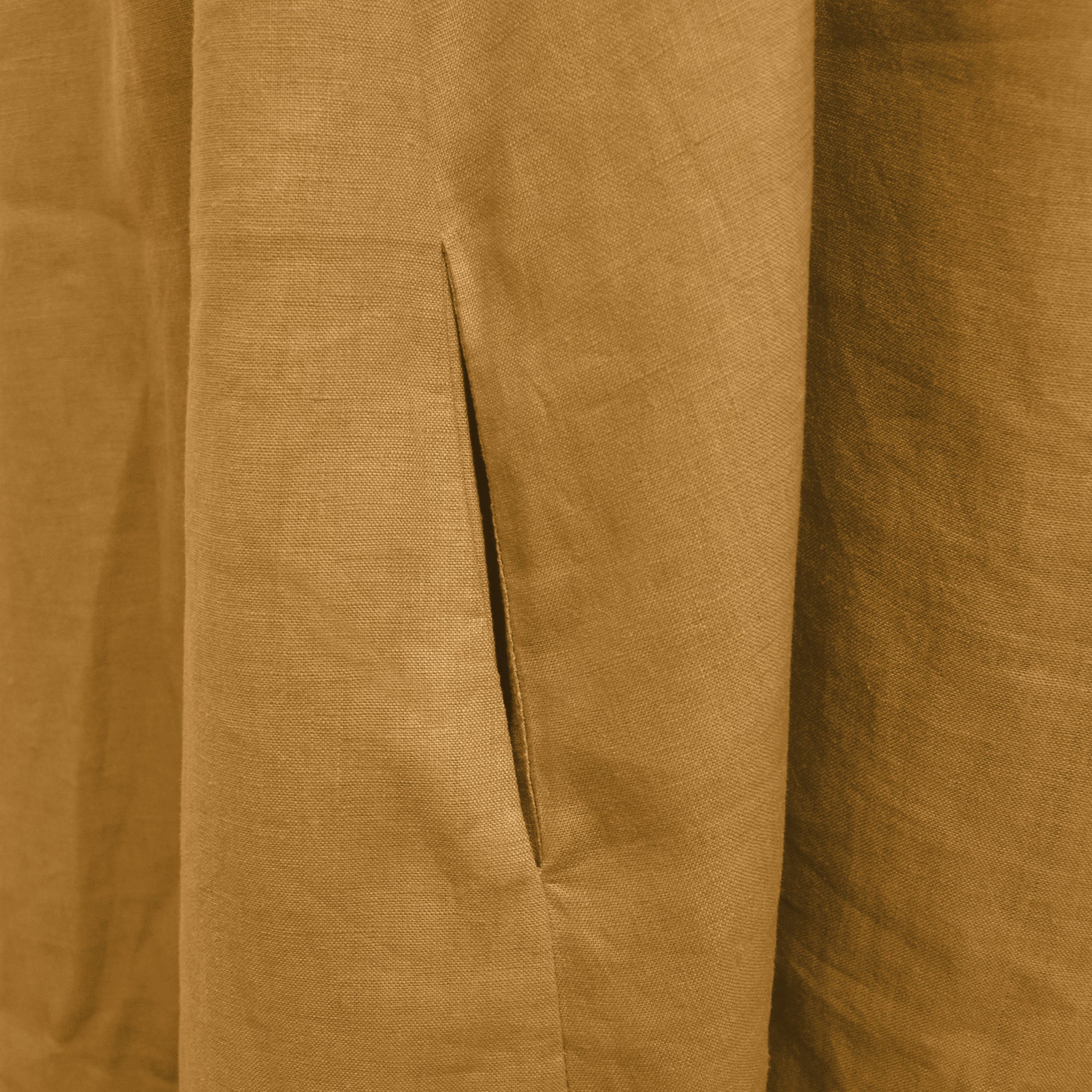 Vestido hecho de 100% lino teñido con tinte natural de cáscara de cebolla obteniendo así un color mostaza. El vestido es manga cero, el largo es por encima de la rodilla y tiene bolsillos a los lados.