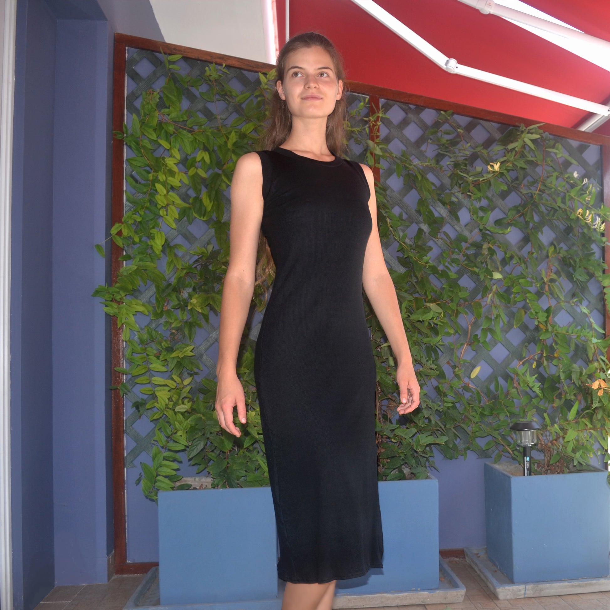 Vestido de rib color negro. La composición es de 95% algodón orgánico certificado y 5% spandex. Es una prenda super versátil que puedes usar tanto de día como de noche, para ocasiones casuales o especiales y en cualquier temporada del año dependiendo de cómo lo uses. Es de excelente calidad y se adapta al cuerpo. Lo tenemos disponible en tallas S, M y L.