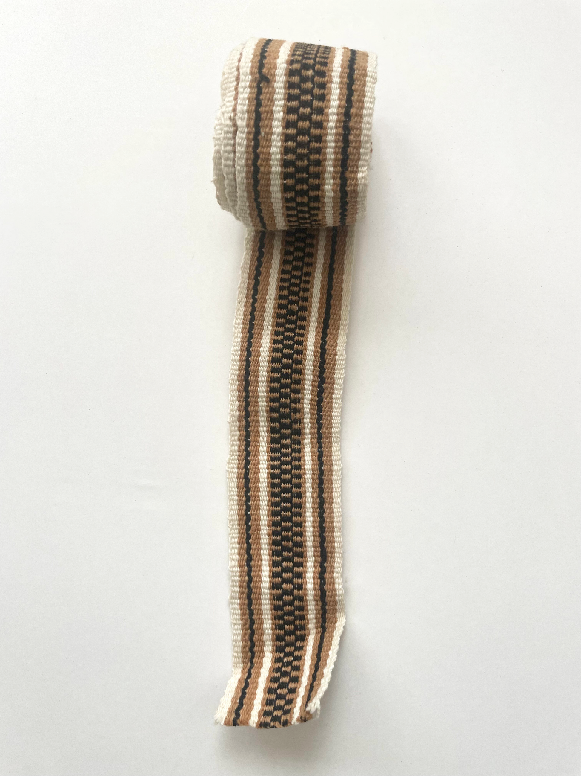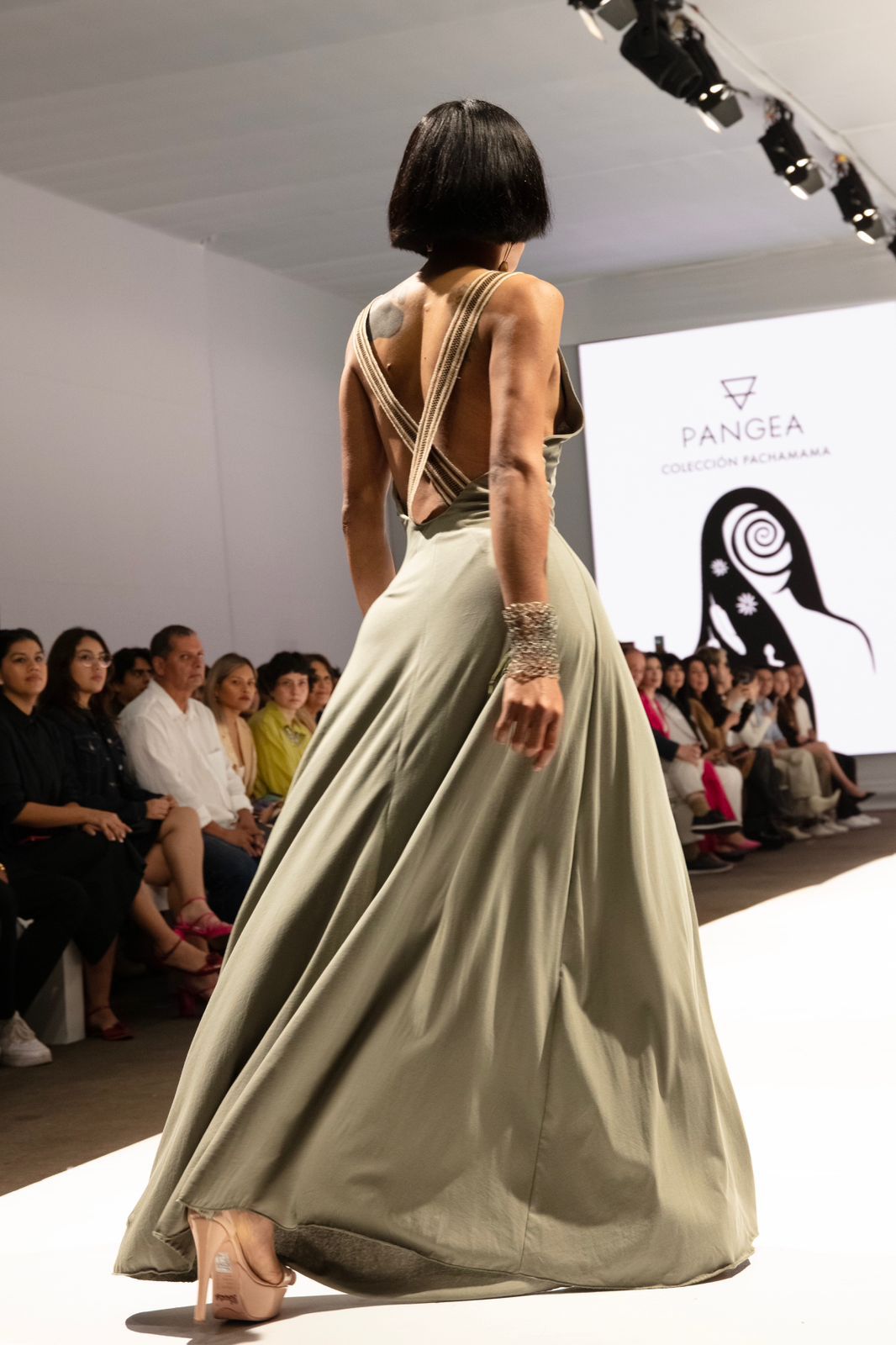 El detalle más especial se encuentra en la espalda: unas cintas cruzadas tejidas a mano por una artesana de la comunidad Matsigenka con la iconografía del pescado. La cinta está elaborada con algodón orgánico en tonos crema, beige y negro, donde los colores crema y beige corresponden al tono natural del algodón, mientras que el negro se obtiene mediante un tinte natural a base de barro y hojas.