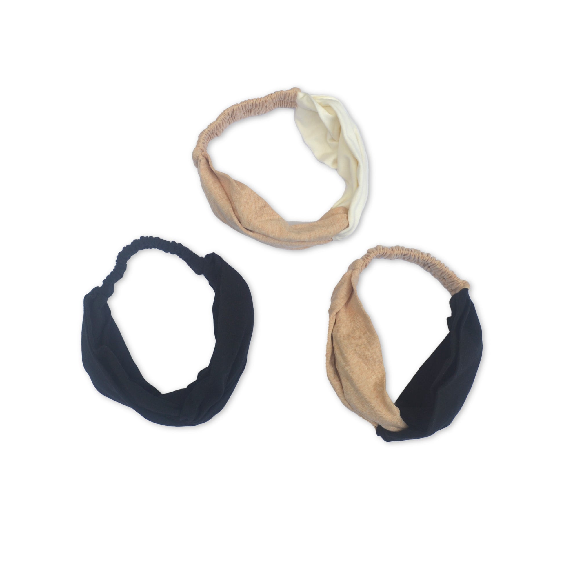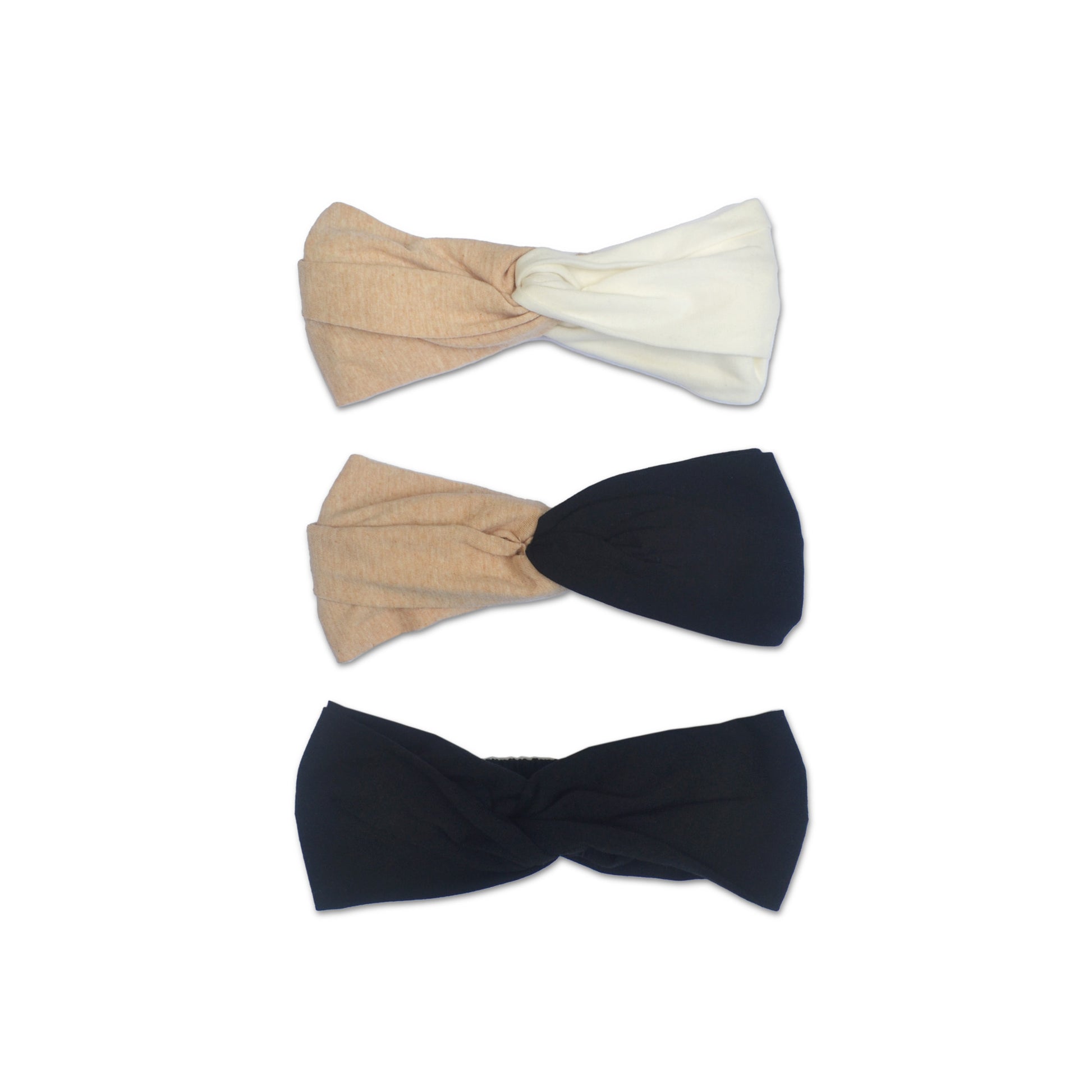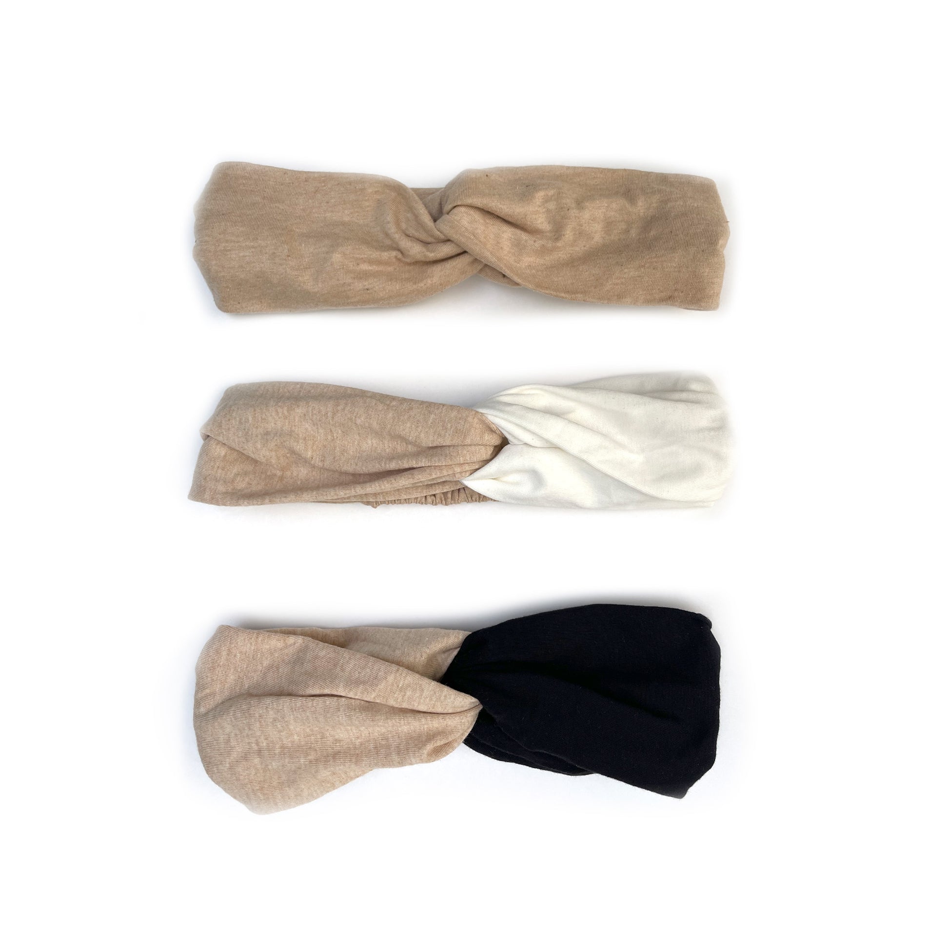 Las vinchas en color beige son de algodón nativo orgánico y las vinchas de color negro de algodón pima orgánico teñido con tinte ecoamigable de bajo impacto. También las tenemos combinadas en dos colores.